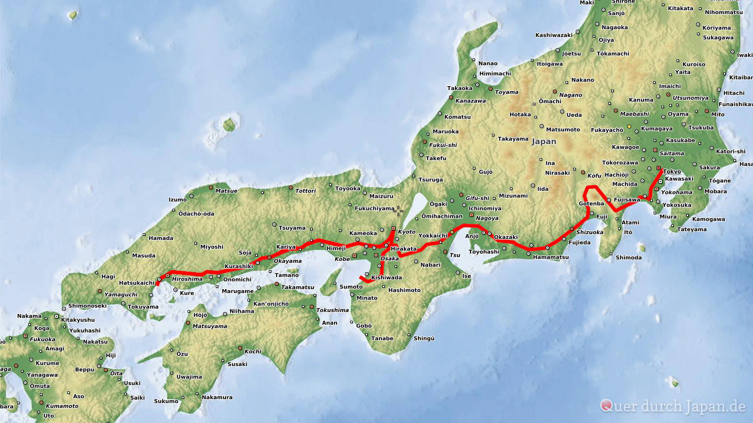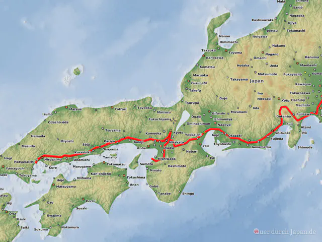 Das ist die Route unserer Japan-Reise… Wir fliegen zum Flughafen Tōkyō Narita, wo wir die Reisegruppe treffen und gemeinsam nach Tōkyō fahren werden. Mit einem Zwischenhalt in Kamakura geht es weiter zum Fuji-Nationalpark, wo wir in einem Onsen übernachten werden. Mit dem Zug fahren wir dann nach Hiroshima, mit einem Zwischenhalt in Okayama. Unsere letzte Station wird Kyōto sein. Vom Flughafen Ōsaka Kansai aus geht es schließlich zurück nach Deutschland.