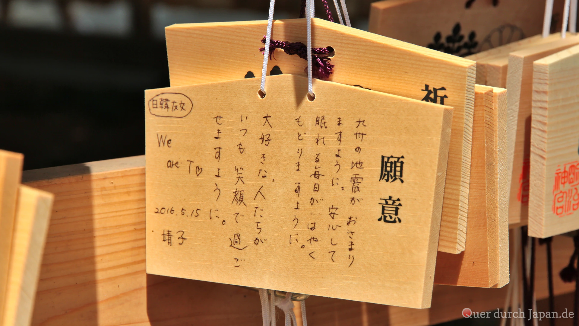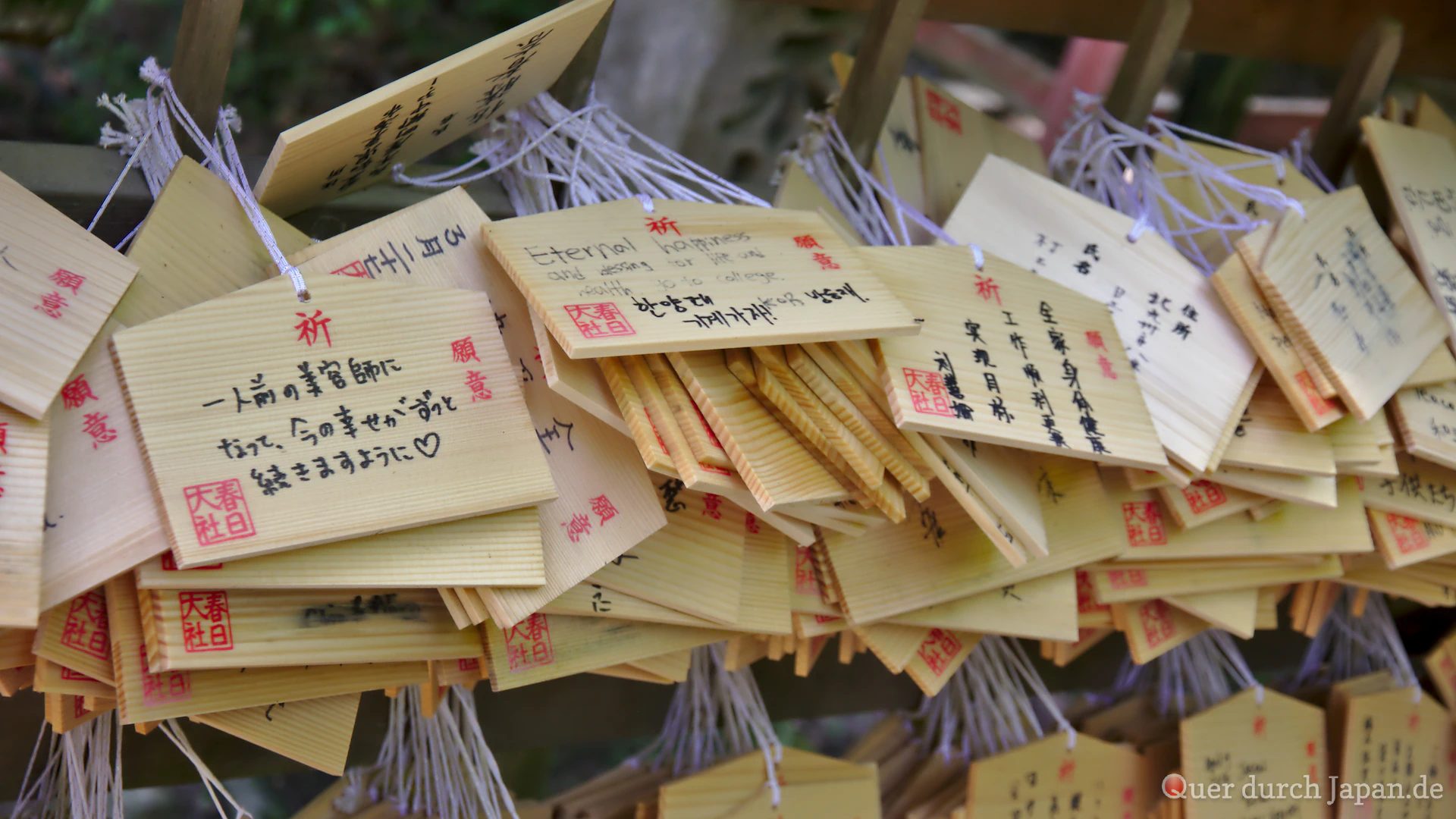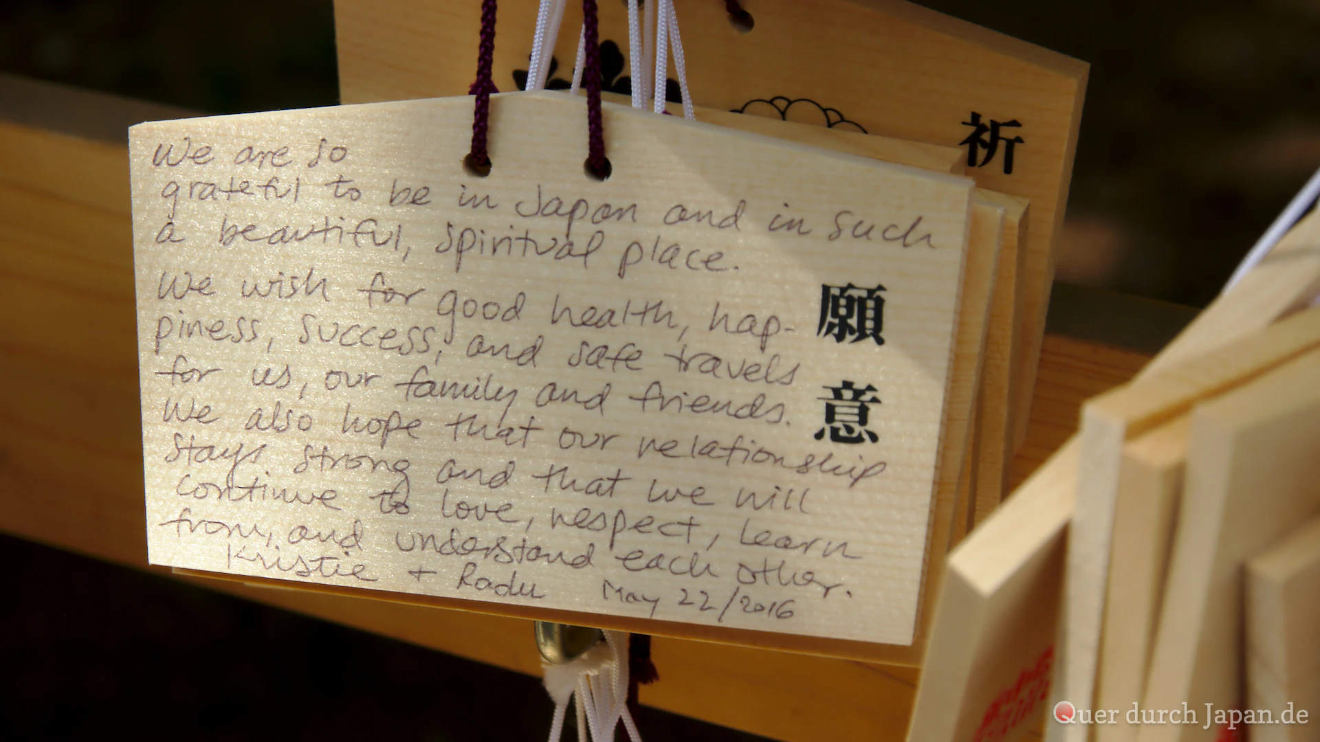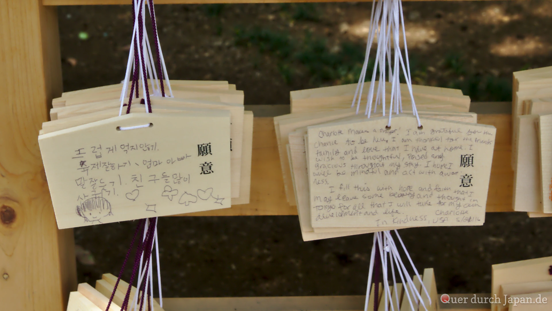 Das Programm an Wünschen ist breit, von Gesundheit und bestandenen Prüfungen über Erfolg im Beruf und einer guten Beziehung bis hin zum Weltfrieden. Selbst Touristen haben den Brauch übernommen, und so findet man nicht nur in japanisch beschriftete Tafeln, sondern auch Koreanisch, Englisch, Deutsch und weitere Sprachen.