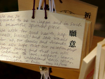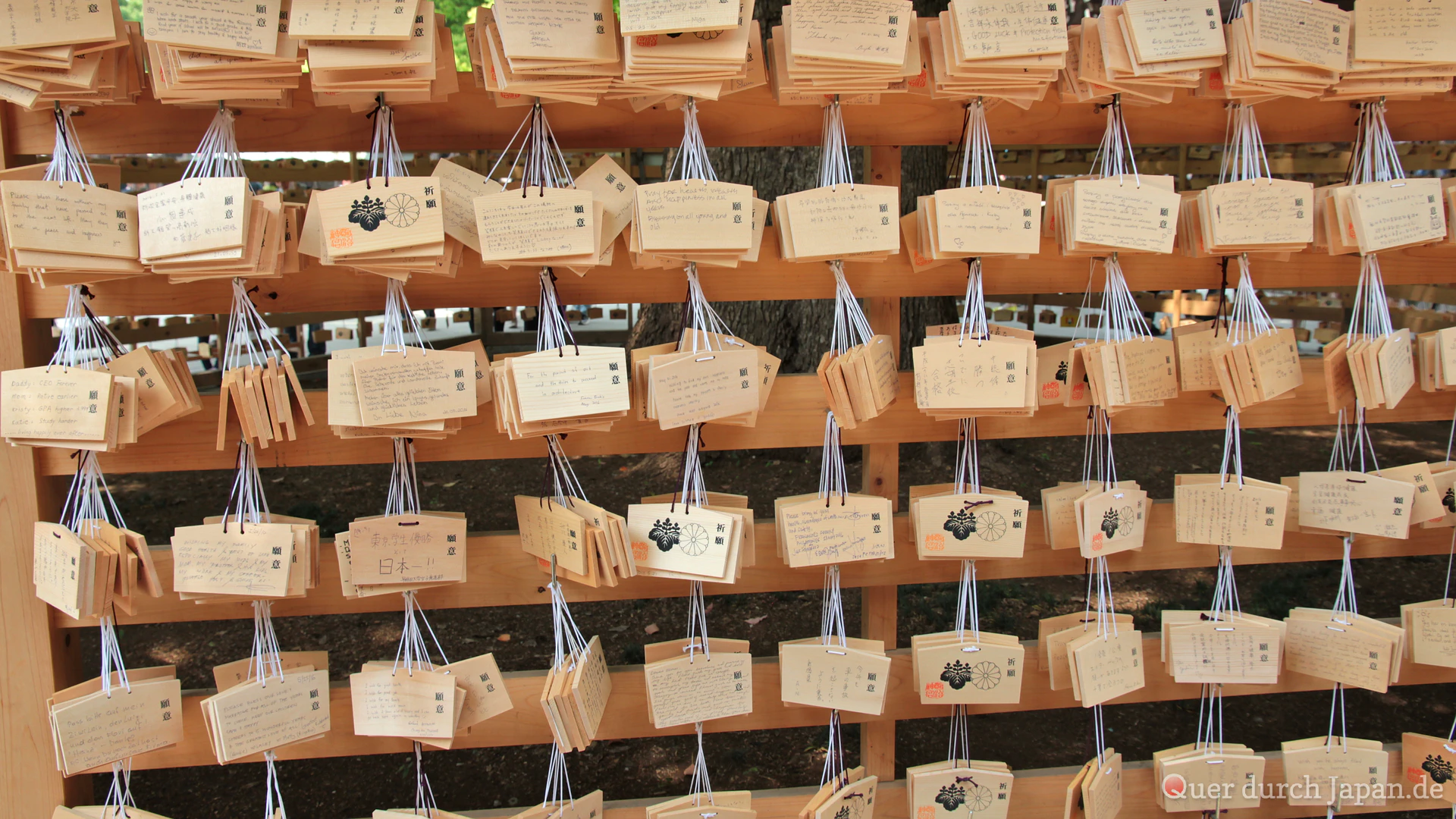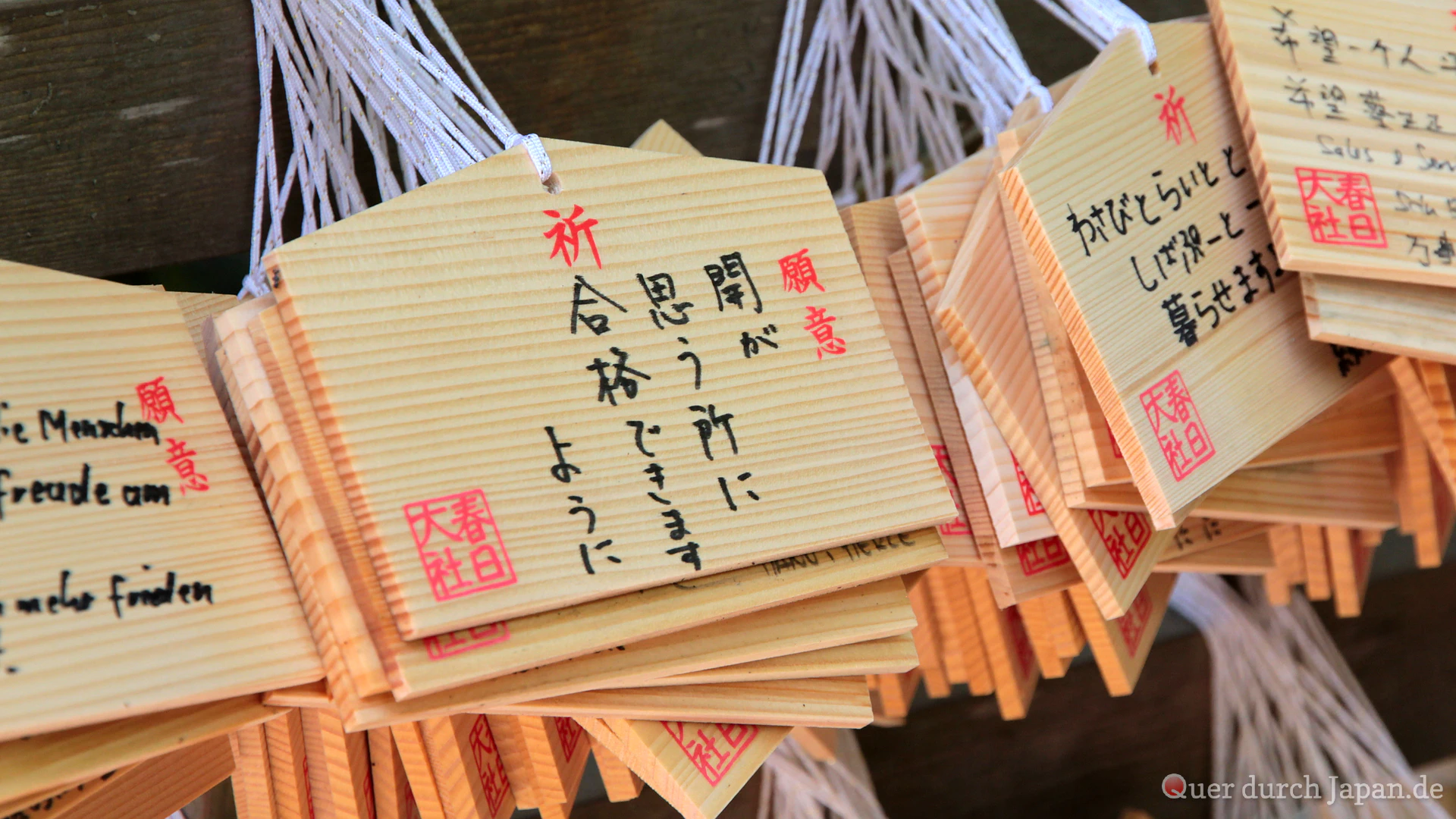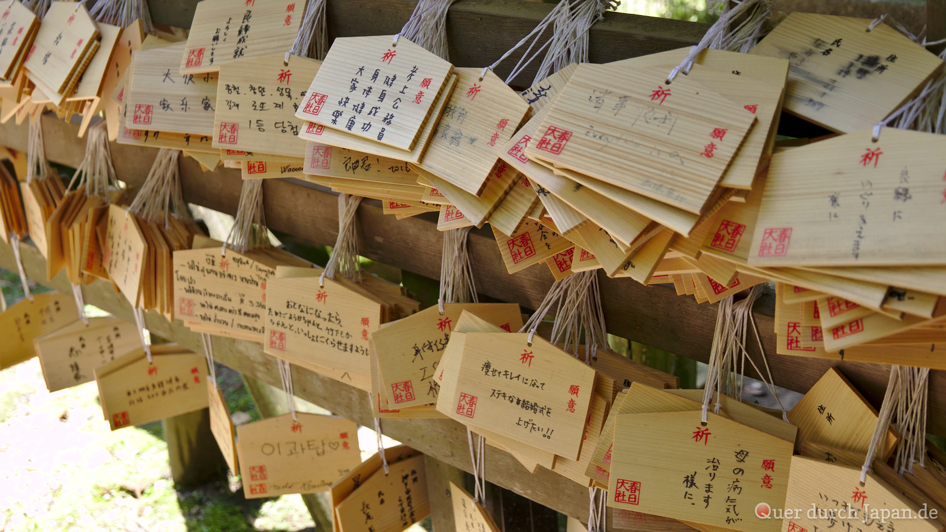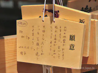Das Programm an Wünschen ist breit, von Gesundheit und bestandenen Prüfungen über Erfolg im Beruf und einer guten Beziehung bis hin zum Weltfrieden. Selbst Touristen haben den Brauch übernommen, und so findet man nicht nur in japanisch beschriftete Tafeln, sondern auch Koreanisch, Englisch, Deutsch und weitere Sprachen.