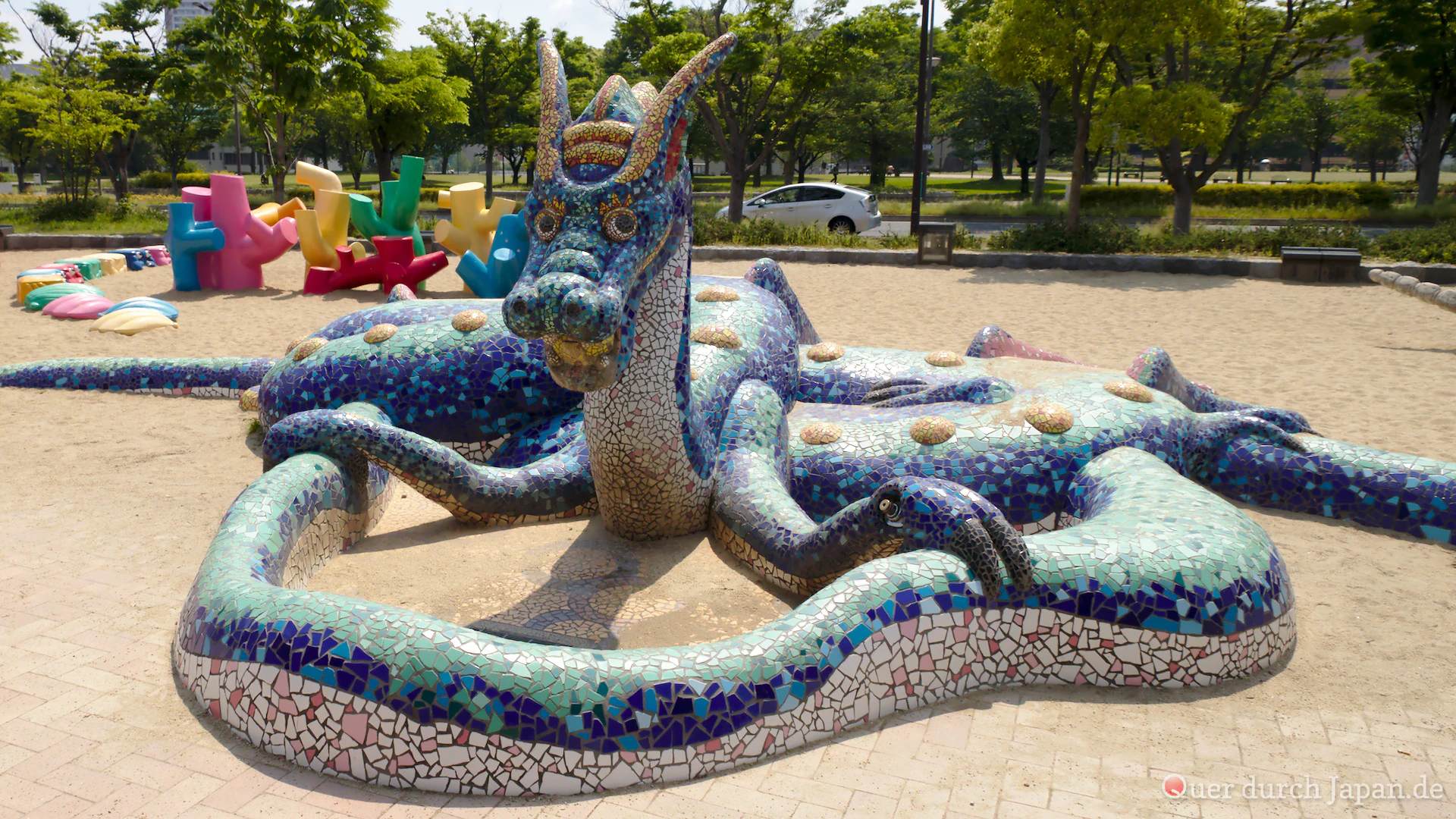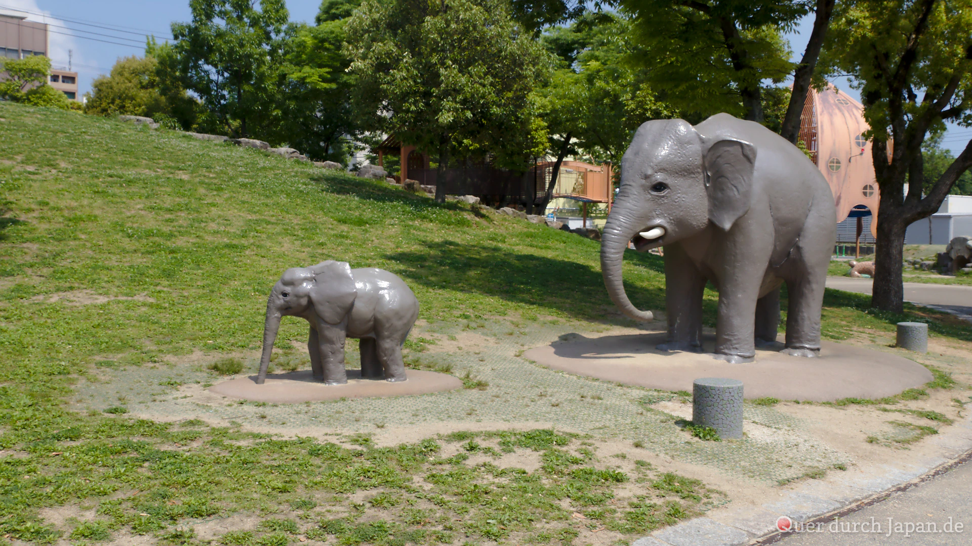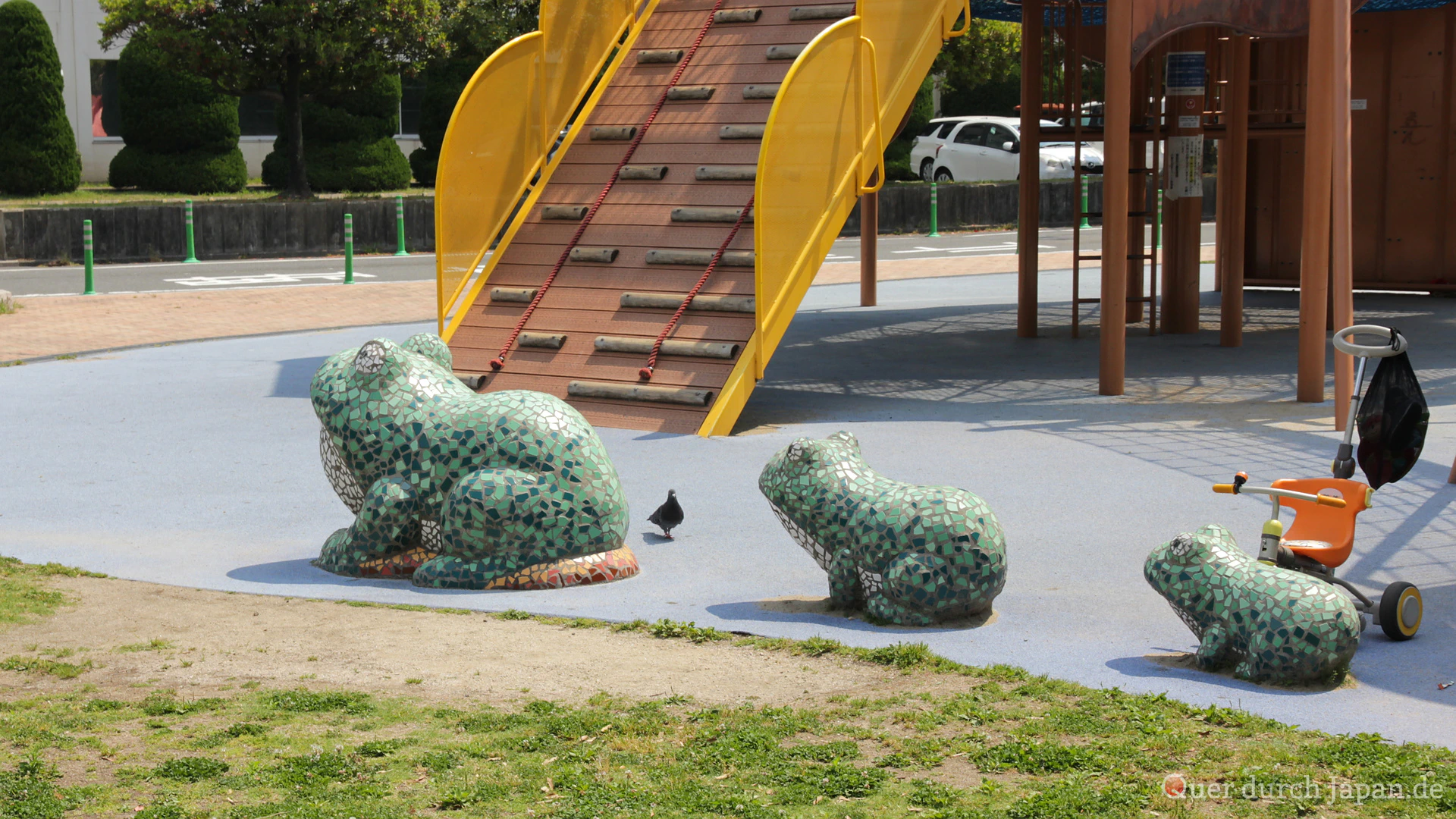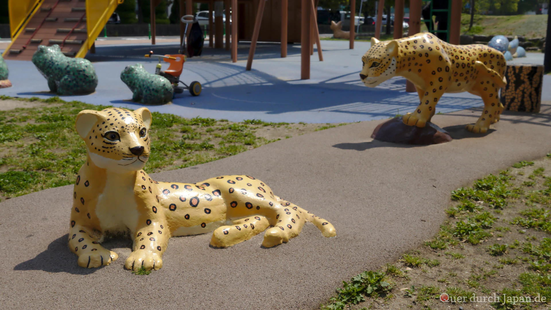 Wir waren an dem Tag in Kitakyūshū und unterwegs vom Bahnhof Kokura zum Tōtō-Museum, als wir an einem Spielplatz vorbeikamen. Er war ziemlich groß und um einen Hügel gelegen. Und er stand voller wilder Tiere, aus Plastik zwar, aber trotzdem liebevoll gestaltet. In einem Sandkasten konnte sogar ein versteinerter Dinosaurier entdeckt werden.