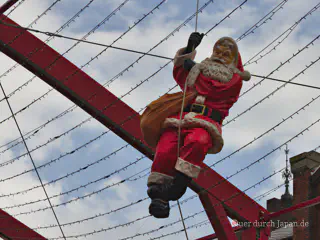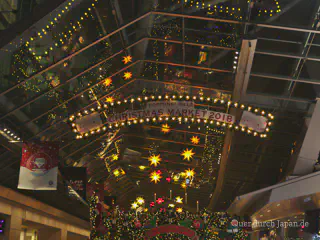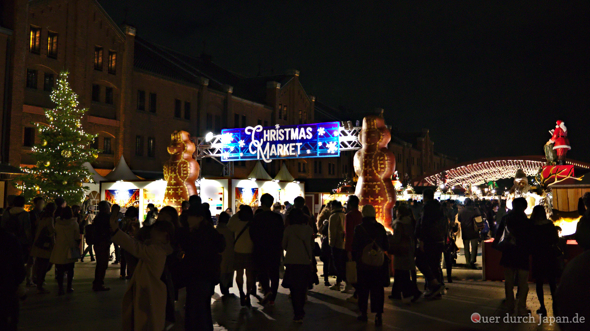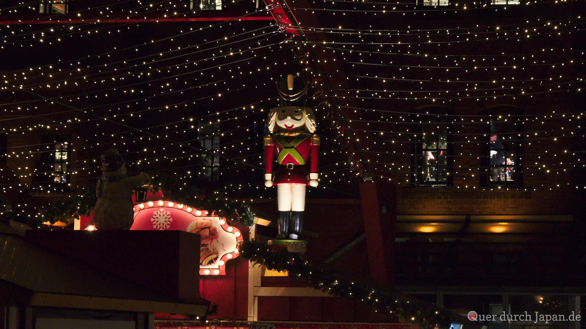 Und dort fuhren wir anschließend hin. Der Weihnachtsmarkt an den Yokohama Red Brick Warehouses ist der größte, den wir bisher in Japan gesehen haben. Es gibt dort etliche Futterbuden mit Glühwein, Bratwurst, aber auch ausgefallenere Speisen wie Kartoffelsuppe oder Hoppelpoppel, dazu noch Buden mit Geschenkartikeln.
