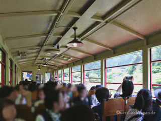 Ich hatte mich schon seit der Reiseplanung auf diesen Ausflug gefreut, aber während der Zugfahrt wollte dann doch keine so rechte Eisenbahnromantik aufkommen. Man sitzt auf Holzbänken und rattert die Strecke entlang. Immer wieder kreischen die Bremsen, um an der nächsten Haltestelle weitere Fahrgäste aufzunehmen. Es geht durch etliche Tunnel. Und wenn man auf der falschen Seite sitzt, sieht man nach dem ersten Zwischenhalt den überwiegenden Teil der Fahrt nur noch auf einen Hang, während man auf der anderen Seite einen (tatsächlich romantischen) Blick auf die Schlucht und den Hozugawa hätte.