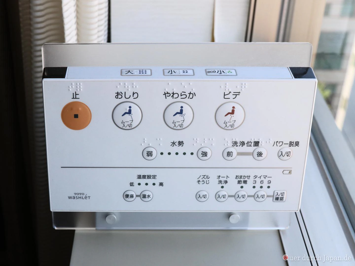Für den Touristen kann die Benutzung eines Washlets zu einer kleinen Herausforderung werden, da die Knöpfe auf Japanisch beschriftet sind. Manche modernen Washlets haben keinen mechanischen Hebel für die Spülung mehr. Dann beginnt das Abenteuer, den richtigen Knopf zu finden, um das Ergebnis seiner Sitzung wegzuspülen. Beim abgebildeten Tableau sind es nicht die auffällig großen Knöpfe, sondern die drei schmalen Knöpfe auf der oberen Seite. Der Knopf links ist für das große Geschäft, der in der Mitte für das kleine, rechts spült nur eine Ökoportion Wasser. Ein kleiner Trost ist, dass die Hersteller der Washlets sich kürzlich auf gemeinsame Symbole einigten.