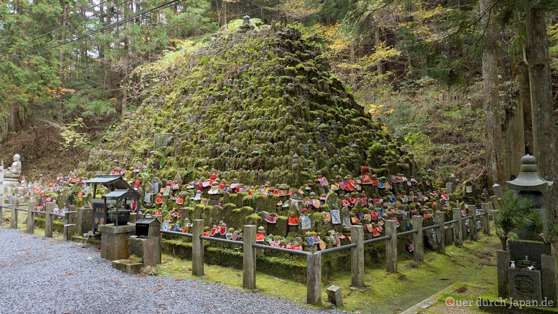 Im Jahr 805 wurde an diesem Ort der Shingon-Buddhismus gegründet. Heute gibt es hier neben etlichen Tempeln auch Japans größten Friedhof. Gäste können außerdem in einem Kloster übernachten, vegetarische Mönchskost und gemeinsames Beten inklusive.